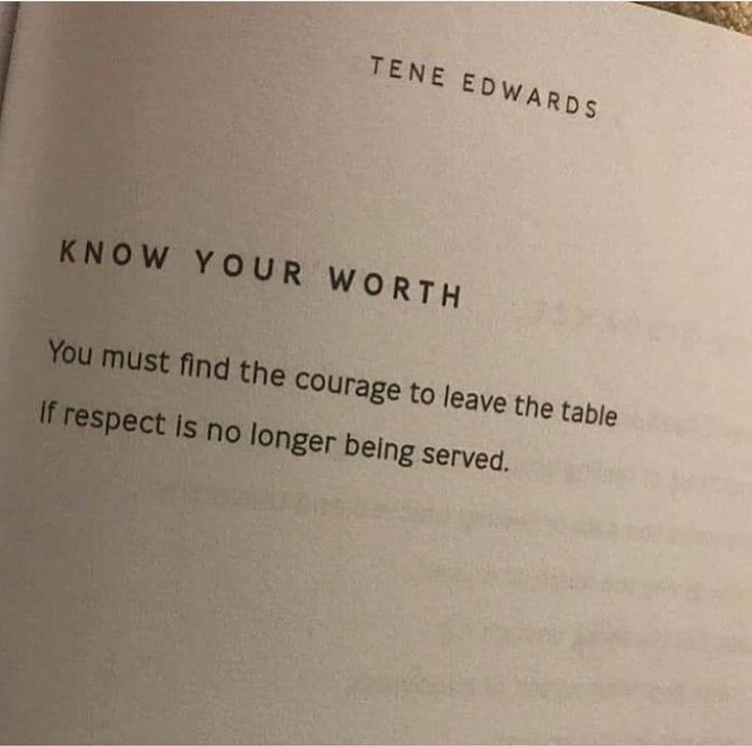 Your time energy and love are very valuable. You were meant to be the one. You must find the courage to leave the table if respect is no longer being served Tene Edwards.